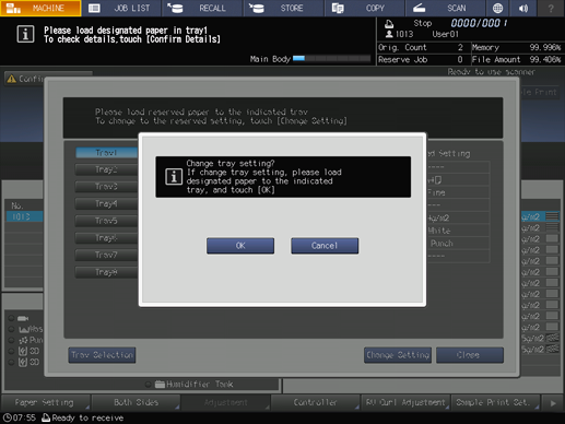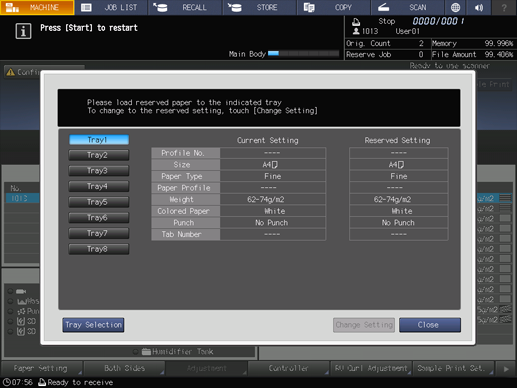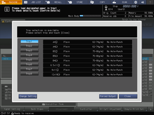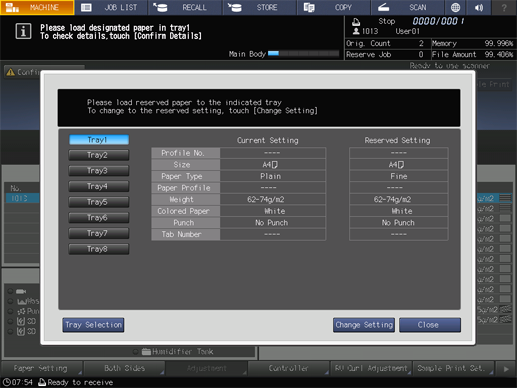 When the message that designates a specific tray is displayed, change the paper settings of the tray (Current Setting) to settings that the print data requires (Reserved Setting). Load the tray with paper that conforms to specified conditions, and then start printing.