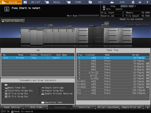 When a tray is specified for the received print data, if the paper of the specified tray does not match the paper conditions, the machine stops temporarily.