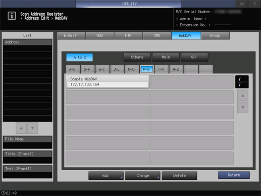 5. Enter information of a destination on the Add WebDAV Address screen. Pressing each item displays each screen to enter characters.