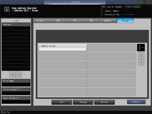 preconditionYou can register more than one destination in one group for E-mail. You can register only one destination in one group for each of HDD, FTP, SMB, and WebDAV.
