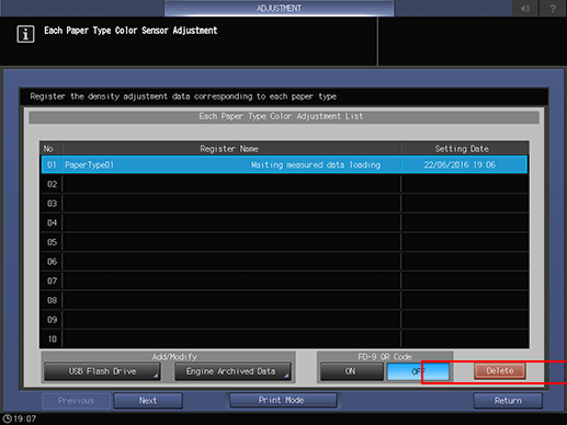 Once you have deleted the color sensor adjustment data for each paper type, you cannot recover it. Please be careful in deletion.
