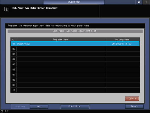 If the color sensor adjustment data for each paper type has already been registered, the register name and date are displayed. If a registered item is selected, the existing data is overwritten.