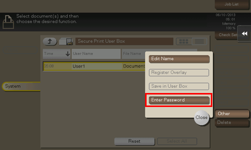 When [Prohibited Functions When Authentication Error] (Here) is set to [Mode 2], you need to enter the password to select a file from the Secure Print User Box. You need to enter the password for each file even if secure documents have the same document ID. Therefore, the security level is higher than that of default [Mode 1].