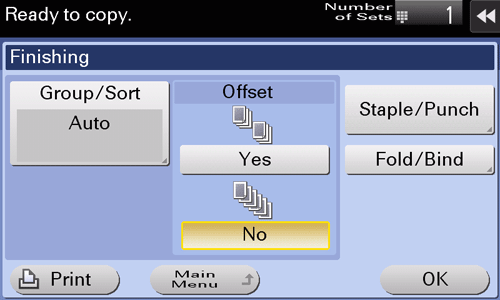 [Offset] | Select [Yes] when sorting by copies or by page to feed out paper. If [Offset] is specified while the Finisher or Job Separator is installed, the printed sheets are fed out and stacked on top of each other with each copy or page set staggered to separate them. If the Finisher or Job Separator is not installed, the printed sheets are fed out and sorted by copies or page in an alternating crisscross pattern when [Offset] is specified while the following conditions are satisfied.