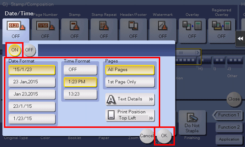 [Fold/Bind] | Select [Center Staple & Fold]. This function staples copies at two places along the center and folds the copies in half before feeding them out. |