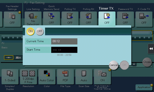 Tap [Application] - [Fax Setting] - [Timer TX], and tap [ON].