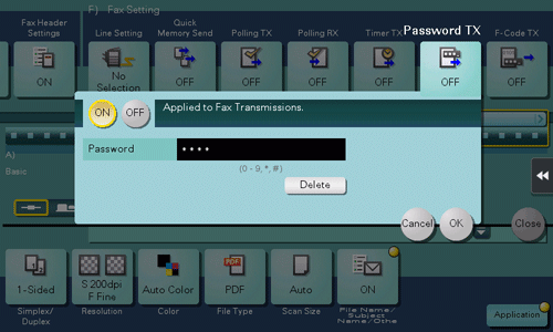 Tap [Application] - [Fax Setting] - [Password TX], and tap [ON].