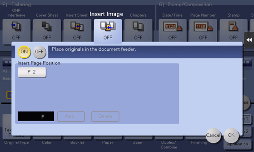 [Insert Page Position] | Specify a page number you want to insert a sheet into. The original is inserted after the page you have specified.