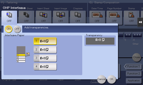 [Interleave Paper] | Select the paper tray for the paper to be inserted between transparencies. The paper size of the transparencies loaded on the Bypass Tray is displayed in [Transparency]. Be sure to use the same size for loaded transparencies and the paper to be inserted. |