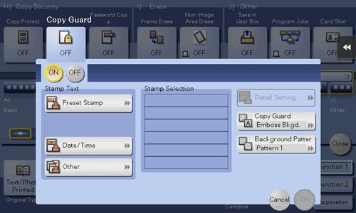[ON]/[OFF] | Select [ON] to set Copy Guard. |