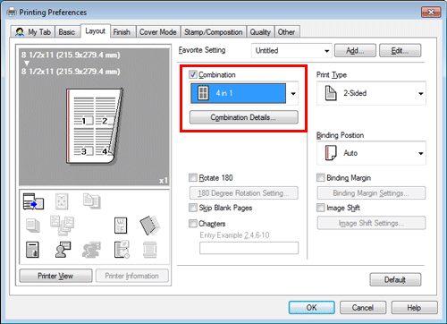 If necessary, click [Combination Details...] to set the page layout order and whether to input border lines between pages.