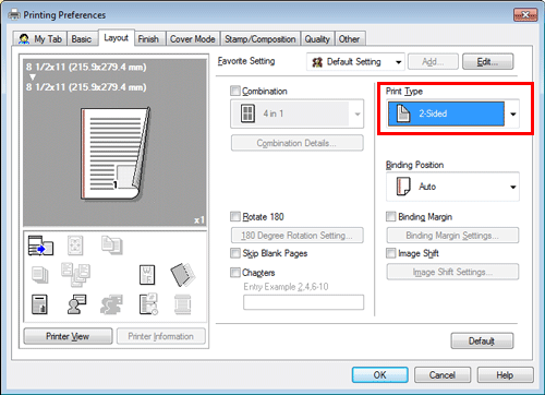 In [Print Type] in the [Layout] tab, select [2-Sided]. [2-Sided] is specified by default.