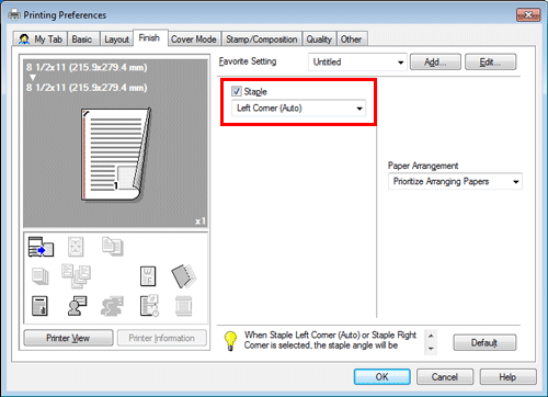 In the [Finish] tab, select the [Staple] check box. In addition, specify the staple position.