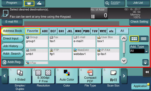 If necessary, you can change the display of the main screen in fax/scan mode (default: [Address Book]). For details, refer to Here.