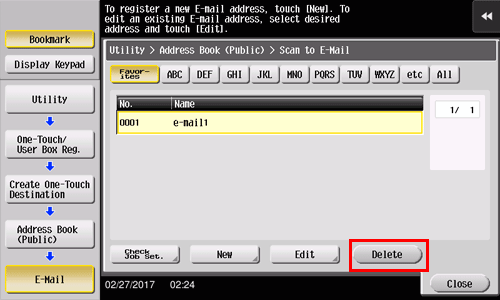 Tap [Utility] - [One-Touch/User Box Registration] - [Create One-Touch Destination] - [Address Book (Public)].