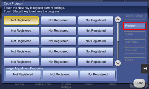 For image adjustment program, you can register the settings of [Original Type], [Density], [Bkgd. Removal], [Text Enhancement], [Neg-/Pos. Reverse], [Image Adjustment], and [Mirror Image].
