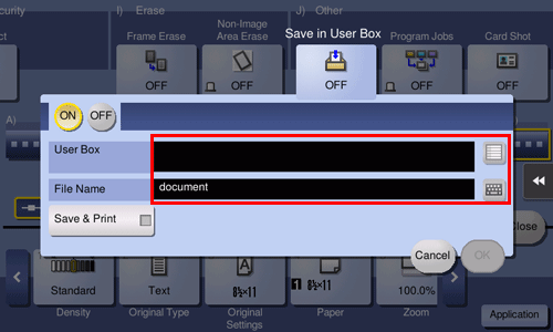 Select [Application] - [Other] to set [Save in User Box] to [ON], and tap the input area or the list icon of the [User Box].