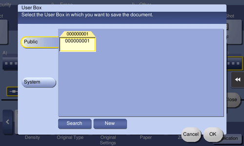 To save the original to a Public User Box, a Personal User Box, or a Group User Box, tap [Public], [Personal], or [Group] and select the destination user box. Tap [New] and enter a new user box number to register the destination user box.