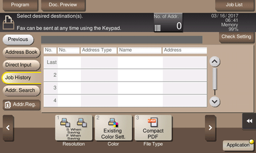 Tap [Job History], and you can select a destination from the scan or fax history.