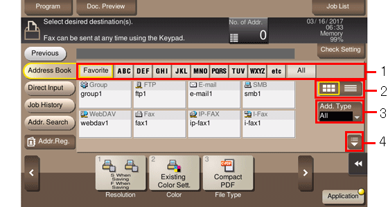 2 | Switches the display of the registered destinations to the button or list view mode. If the list view mode is selected, you can sort destinations by registration number, destination type, or registered name. |