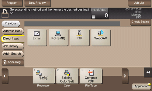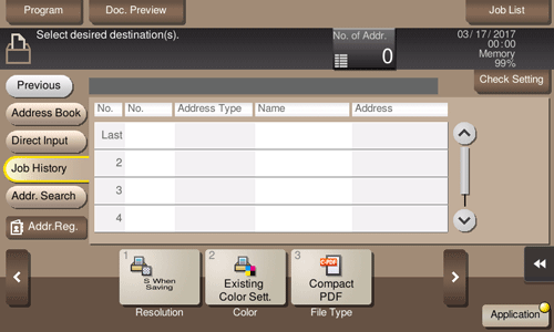 Tap [Job History], and you can select a destination from the scan or saved job history.