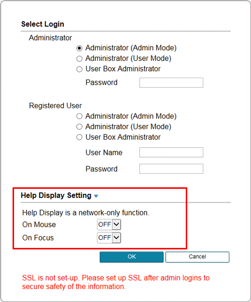 In the screen to log in to the administrator mode, you can specify the method to display the popup help.