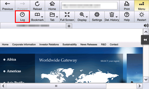Tapping [Menu] - [Log] on the toolbar displays a list of pages displayed up till the current time.