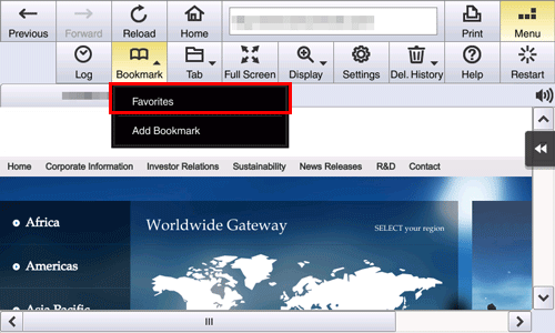 Tapping [Menu] - [Bookmark] - [Favorites] on the toolbar displays a list of favorites registered on this machine.