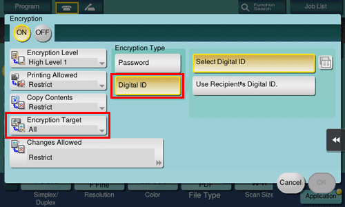[Encryption Type] | Select [Digital ID] to encrypt a PDF file with a digital certificate. Select [Select Digital ID], then tap the icon to display a list of E-mail addresses. From the list, select an E-mail address that contains a digital certificate for encryption. Selecting [Use Recipient's Digital ID.] uses a digital certificate registered in the PDF file sending destination. |