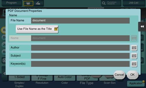 To configure PDF file properties, select [PDF] or [Compact PDF] as the file type, and tap [PDF Detail Setting] - [PDF Document Properties]. Then, configure the following settings.