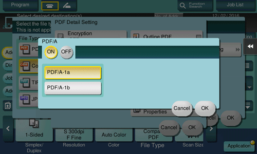 [ON]/[OFF] | Select [ON] to create a PDF file based on PDF/A. |