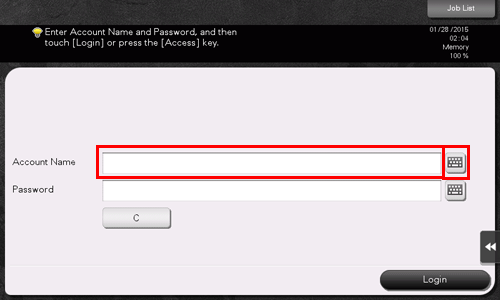 Enter the user or account track name and the password on the Login screen, then tap [Login] or press the Access key to perform authentication. After a target operation is completed, press the Access key to log out.