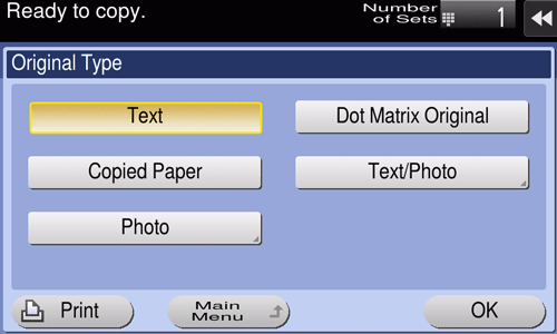 [Text] | Copy an original, which consists primarily of text, at the optimum level of image quality. This function sharpens the edges of each character, creating easy-to read images. |
