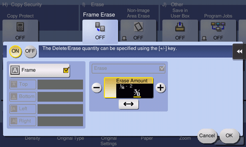 [Frame] | Select this option to erase the four sides of the original to the same width. In [Erase Amount], tap [+]/[-] for the inch area, tap [+]/[-] or Keypad for the centimeter area to specify the width of the area to be erased. To display the Keypad, tap the input area for the numeral. |