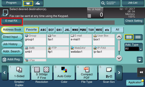Tap [E-mail RX] to inquire the mail server, and receive and print any fax receipt message.