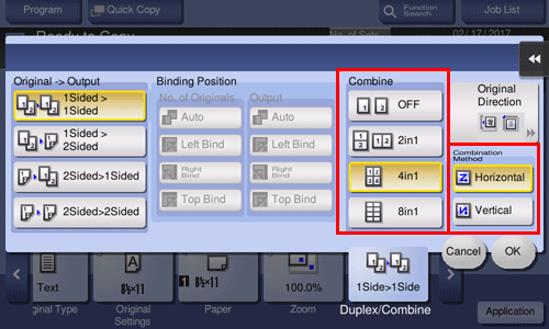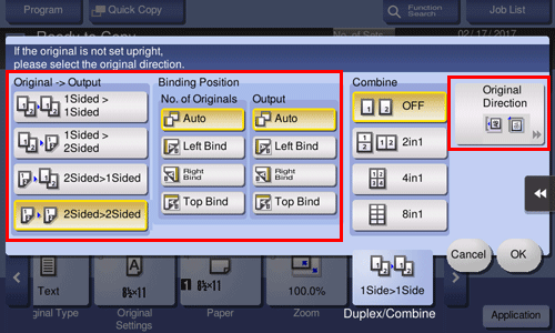 [Original > Output] | Select a combination of the original to be loaded (1-sided original or 2-sided original) and the copy method (1-sided copy or 2-sided copy). If you have selected other than [1Sided > 1Sided], also specify [Binding Position] and [Original Direction]. | |