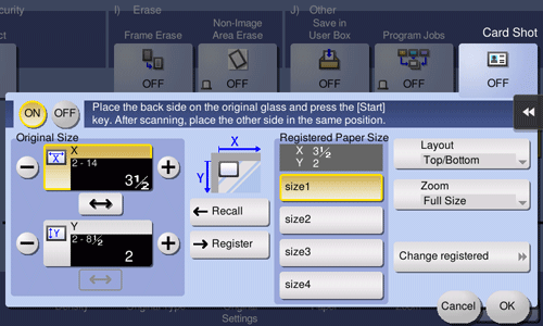 [Original Size] | Specify the size of the card to copy by tapping [+]/[-] for the inch area, by tapping [+]/[-] or Keypad for the centimeter area. To display the Keypad, tap the input area for the numeral. From the [Registered Paper Size], you can recall a size previously stored and specify the size. After you have entered the size, select a key in [Registered Paper Size], and tap [Register]. Then the size you have entered is registered in the memory. You can recall the registered size in the future. |