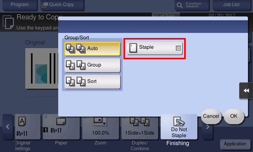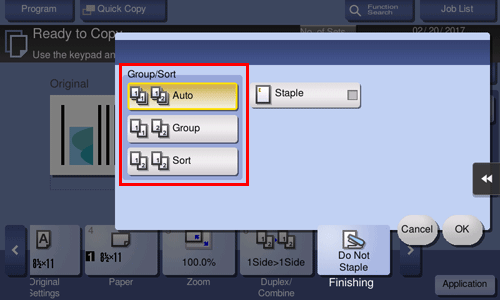 [Auto] | Automatically switches between Sort and Group according to the number of printed sheets for each set, and feeds out. If the number of printed sheets for each set is 1, the Group function is applied. If the number is 2 or larger, the Sort function is applied. |