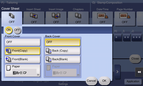 [ON]/[OFF] | Select [ON] to specify Cover Sheet. |