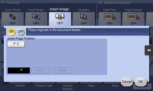 [Insert Page Position] | Specify a page number you want to insert a sheet into. The original is inserted after the page you have specified.