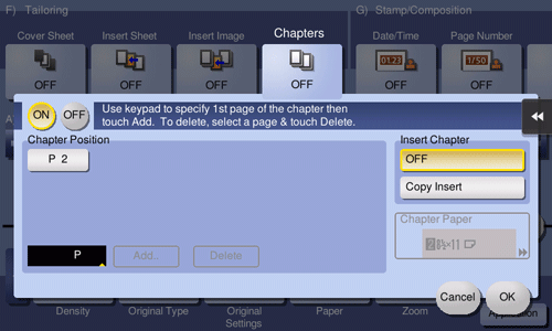 [Chapter Paper] | If [Insert Chapter] is set to [Copy Insert], select the paper tray where the Chapter Paper is stacked. If the chapter paper and text paper differ, use the same size of paper and stack them in the correct direction. |