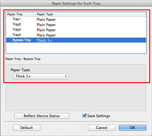In [Paper Settings for Each Tray...], you can set a paper type for each tray. When you specify anything other than [Auto] in [Paper Tray:], the paper type information specified here is applied.