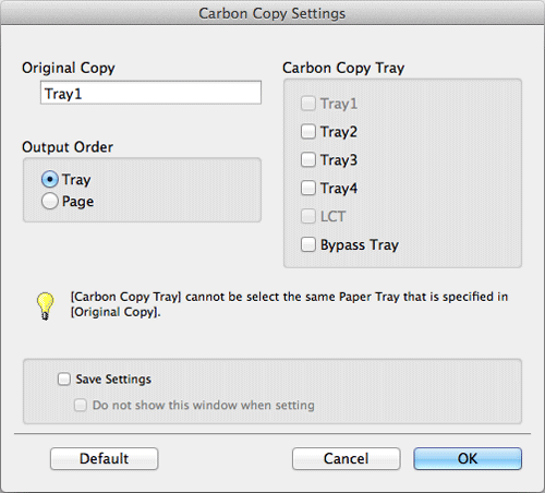 [Save Settings] | When the Save Setting check box is selected, the settings are saved. When the [Do not show this window when setting] check box is selected, this dialog box is not displayed when [Carbon Copy] is enabled. Using this function, you can save steps to configure settings the next time and after if you always specify the same carbon copy tray settings to execute a print job. |