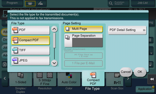 [PDF Detail Setting] | If [PDF] or [Compact PDF] is selected for file format, you can configure the PDF option settings. You can enhance security by attaching a digital signature that identifies the author of the file, by file encryption, etc. For details, refer to Here. |