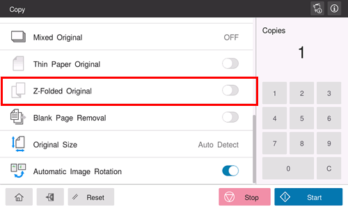 If a folded original is loaded into the ADF, the original size may not be able be detected accurately. To scan the folded original on the ADF, set this option to ON.