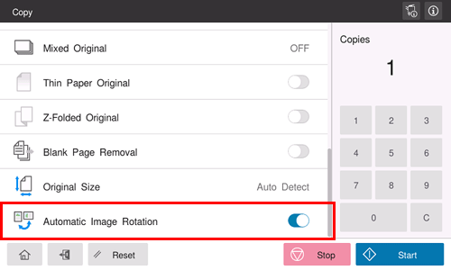 In general use, this machine automatically rotates the original image according to the paper direction to make a copy. Turning [Automatic Image Rotation] OFF as needed enables you to make a copy without rotating the original image. This function is available when you want to copy only a part of the original.