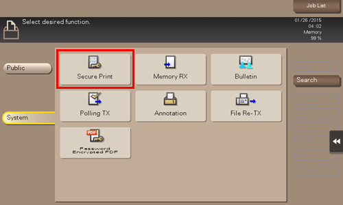 2. Tap [System] - [Secure Print].