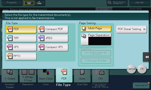 • [Page Separation]: Divides a file into a specified number of pages for transmission using E-mail, SMB, or FTP transmission. For example, if you enter "2" to scan 10 original pages, the original is divided into five separate files. The specified number of pages is stored and the pages are saved as a single file ([Multi Page]) in a User Box. Pages are converted as a single file by the specified number of pages.