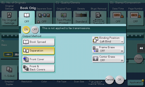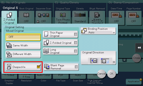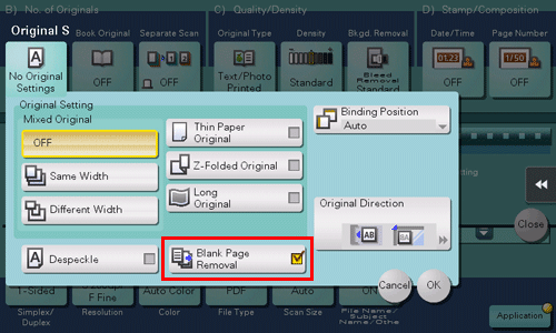 • [Bleed Removal]: Select this option to prevent bleeding of the back of the paper when printing a 2-sided original that is so thin that the contents of the back side would be scanned.