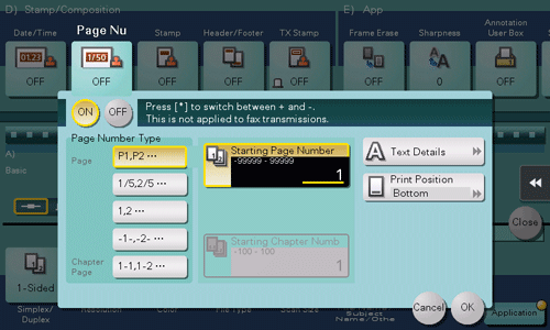 For example, to print page numbers from the third page of the file, enter "-1". The first page of the file is counted as "-1", the second page as "0", and the third page is counted as "1". In [Starting Page Number], a page number is printed on pages 1 and later. If "2" is entered, page numbers are printed from the first page of the file as "2, 3", etc. in order. "-" (minus sign) switches "+" and "-" each time you tap [*].
